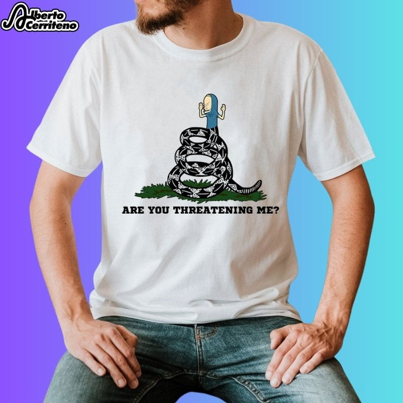 Have a look at the detailed information about the Funny Gadsden Flag Beavis Are You Threatening Me T-Shirt below!: